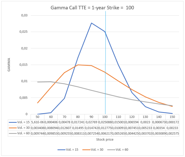 Aan het begin van dit stukje leest u dat de gamma voor zowel een put als een call altijd positief is.