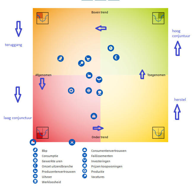 Het CBS houdt voor tal van factoren de stand bij en heeft deze verwerkt in een conjunctuur klok, welke te zien