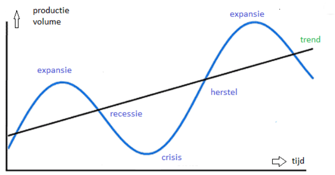 hoogconjunctuur naar recessie en uiteindelijk naar laagconjunctuur.