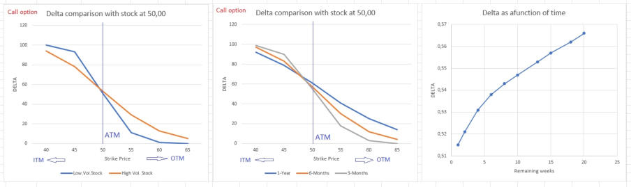 De delta is een getal tussen 0 en 1 voor een Call optie en tussen 0 en -1 voor een Put optie  U ziet dit getal altijd weergegeven bij een optie matrix bij uw broker.  Het is het getal wat de gevoeligheid van de optiepremie aangeeft bij een verandering van de onderliggende waarde.  Wanneer de Delta bijvoorbeeld 0,72 is, dan zal de waarde van de optie toenemen of afnemen met 72% van de waarde wijziging van de onderliggende waarde. Stel de onderliggende waarde stijgt van 12 naar 13, ofwel een toename van 1. De optiepremie van een Call zal dan met 72% van 1 stijgen, dus toenemen met 0,72. . Zoals ik al vertelde verloopt de toename / afname niet lineair, maar volgens een kromme. Een Call optie die far-OTM is zal een Delta hebben van nagenoeg 0 Een Call optie die far-ITM is zal een Delta hebben richting de waarde 1. Een Put optie die far-OTM is zal een Delta hebben van nagenoeg 0. Een Put optie die far-ITM is zal een Delta hebben richting de waarde  -1. Daar tussen in zit een versnelling in toename / afname van de Delta wanneer deze naar de ATM beweegt. De versnelling in de toename/afname is het hoogst rond het punt waar de optie ATM wordt/is.  U zie dit weergegeven in onderstaande grafieken, eerst voor een Call en daaronder voor een Put optie.                                                    . Let op de verticale schaal verdeling, dat is een positief getal bij de Call optie en een negatief getal bij de Put optie . Dan kent ieder wel de uitspraak dat de Delta ruwweg een indicatie is van het percentage dat de optie waarschijnlijk winst op gaat leveren. Een Delta van 0,1 is dan 10% ofwel 90% kans dat ie niks op gaat leveren. Een Delta van 0,9 is dan 90%, ofwel slechts 10% kans dat ie niks op gaat leveren. . Daar is de Delta niet voor bedoeld, maar ergens wel logisch. . Ik zal dat proberen uit te leggen. . Stel, we verwachten een stijging voor Alfen, die momenteel de dag afsloot op de waarde 65,26 , en we willen van die verwachting profiteren door eenvoudig een Call te kopen. Er is een enorm aanbod van opties, wat betreft premie en looptijd, maar we verwachten voor dit voorbeeld de stijging op korte termijn, en kijken naar de serie van 16 -Juni. We twijfelen tussen de keuze van een Call met strike 58 (oeps…. Beetje prijzig) en een Call met strike 70 (lekker ‘goedkoop’). . Vanavond lees ik nabeurs de volgende (midprice)  waarden: C 58 premie 7,95 en een Delta van 0,926 C 70 premie 0,39 en een Delta van 0,147 Wat is nu de ‘beste’ strike om aan te schaffen? . De Call met strike 58 heeft een Delta van 0,926 ofwel 92,6% kans dat deze ITM eindigt. De Call met strike 70 heeft een Delta van 0,147 ofwel 14,7% kans dat ie ITM eindigt. . Daar zit al een waarschuwing in. . Laten we e.e.a. effe uit elkaar trekken. . Call strike 58 met een premie van 7,95 De intrinsieke waarde is op dit moment  65,26 – 58  geeft 7,26 De tijdwaarde bedraagt dan 7,95 – 7,26 = 0,69 Dat houdt in, dat zodra Alfen ruim 1% in waarde stijgt, je winst gaat maken; immers de tijdwaarde (lucht) die je betaald hebt is dan al ‘verdiend’ en de rest wordt winst. . Call strike 70 met een premie van 0,39 De intrinsieke waarde is 65,26- 70 is negatief 4,74. Intrinsiek kan niet kleiner zijn dan 0, dus de intrinsieke waarde is 0. De premie van 0,39 is dus volledig tijdwaarde. Lekker goedkoop, en de tijdwaarde is zelfs nog minder dan die van de Call met strike 58. Maar, wanneer gaat deze optie bij expiratie nu winst opleveren? Om break-even te komen zal de koers van Alfen naar 70 + 0,39 geeft de waarde 70,39 moeten gaan, en daarboven wordt pas winst gemaakt. Van 65,26 naar 70,39 is een stijging van 5,13 ofwel 7,8% . Vergelijken we de getallen, dan zien we dat bij de strike 58 de koers slechts 1% hoeft te stijgen om winst te maken, terwijl bij de strike 70 de koers 7,8% moet stijgen om in het winst gebied te komen. En de kans dat de koers meer dan 1% stijgt is natuurlijk vele malen groter dan dat de koers meer dan 7,8% stijgt.  . En dat is wat het getal Delta ‘weergeeft’ wat betreft de verwachting dat de optie winst gaat opleveren. . Blijft natuurlijk over de vraag: waardoor wordt de Delta beïnvloed? De Delta wordt beïnvloed door de Gamma, ook een griek.  Daarnaast is de delta ook afhankelijk van de volatiliteit van de onderliggende waarde, en de looptijd van de optie. U ziet dat in de onderstaande grafieken.    .