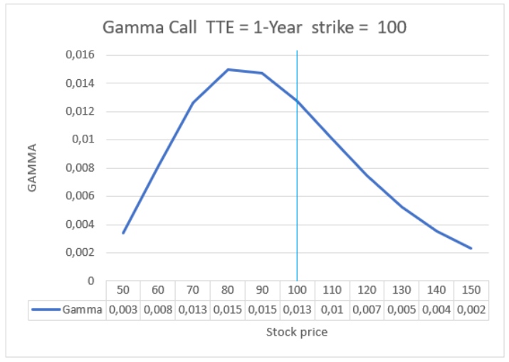 Hieronder ziet u de grafische weergave van de gamma voor een Call optie.