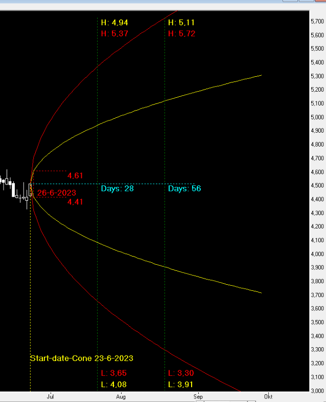 Een koers welke boven deze waarde in het gebied +1Sd ligt is ‘waarschijnlijk’ te hoog en een koers welke in