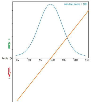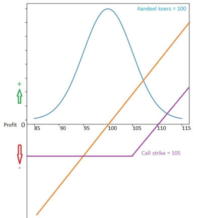 Hieronder dezelfde figuur waarbij de aanschaf van een Call met strike = 105 is ingetekend.