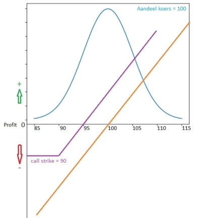 Laten we dit eens bekijken voor een call met strike = 90 en premie = 5, wat in onderstaande figuur wordt
