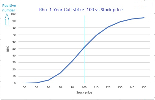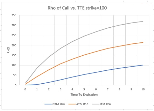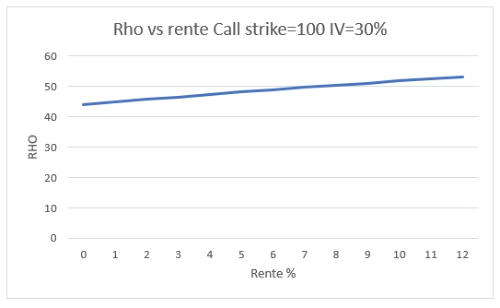 RHO Rho is het getal wat de gevoeligheid van de optiepremie weergeeft voor de rente stand. Dit getal werkt positief uit voor een Call, de premie van de Call stijgt wanneer de rente  stijgt maar daalt wanneer de rente daalt. Het werkt negatief uit voor een Put, de premie daalt wanneer de rente stijgt, maar stijgt wanneer de rente daalt. Het getal rho geeft aan hoeveel de premie stijgt of daalt. Ook van invloed op de rho is de vraag of de optie OTM - ATM of ITM is. Deze invloed ziet u weergegeven in onderstaande grafiek voor een Call optie. De laatste invloed op de rho waar we nu even naar kijken is de resterende looptijd van de optie, in dit geval een call. U ziet die invloed in onderstaande grafiek. Een langere looptijd doet de rho in waarde toenemen. Ook ziet u dat ITM-Call de hoogste rho heeft en dat deze afneemt naarmate de optie verder OTM gaat.