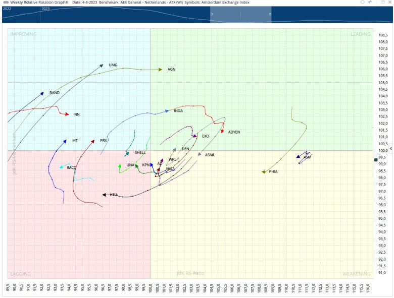 Hieronder ziet u de RRG grafiek van de AEX index - fondsen in het eerste weekend van Augustus.