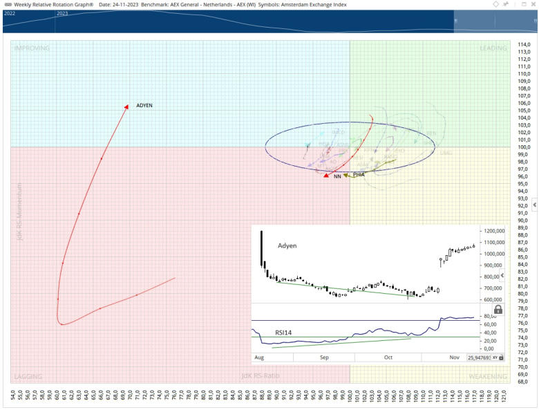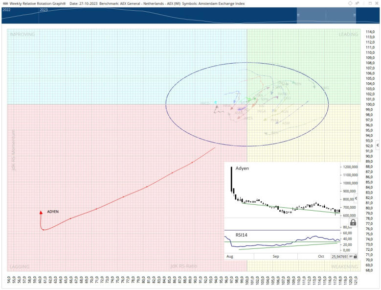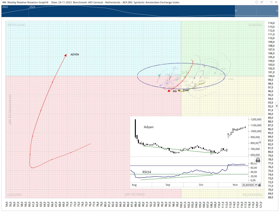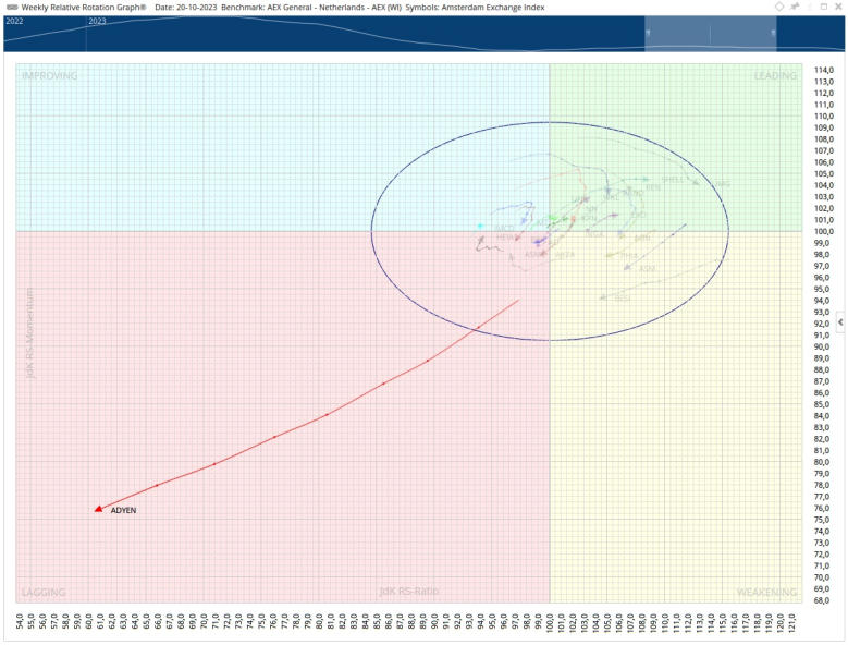 We zien dat Adyen opp dat moment al meer dan een maand terug loopt in momentum (elke stip op de staart is een week) en nu zelfs zuidwaarts gaat,